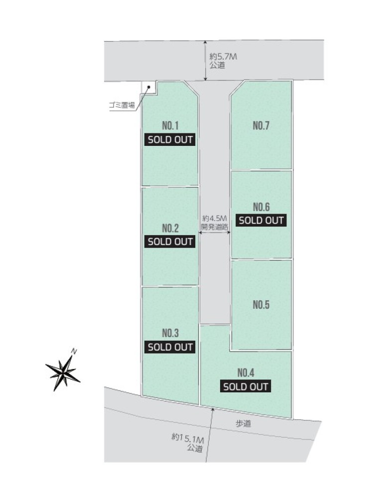 | 販売区画数 | 全7区画 今回販売2区画 | 土地面積 | 112.38㎡〜115.62㎡ |